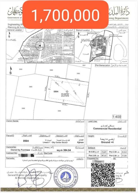 Selling Commercial Residential Land in Liwara - 1, Ajman. Area (m2) 756.11. Height Ground + 4. Price 2.5 Million but negotiable. only Serious buyers contact