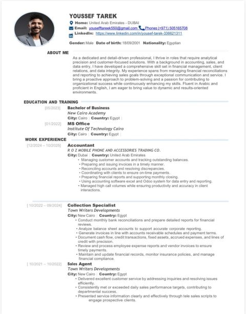 My name is Youssef Tarek Ahmed. I have a Bachelor of commerce degree, specializing in Accounting. I worked in Egypt for two years as a collections accountant for a real estate company. I worked in sales for one year for a real estate company. I worked as a football analyst for one year for Stats Bomb. I worked for R O Z a mobile phone and shipping company, for 10 months in Dubai, I performed several