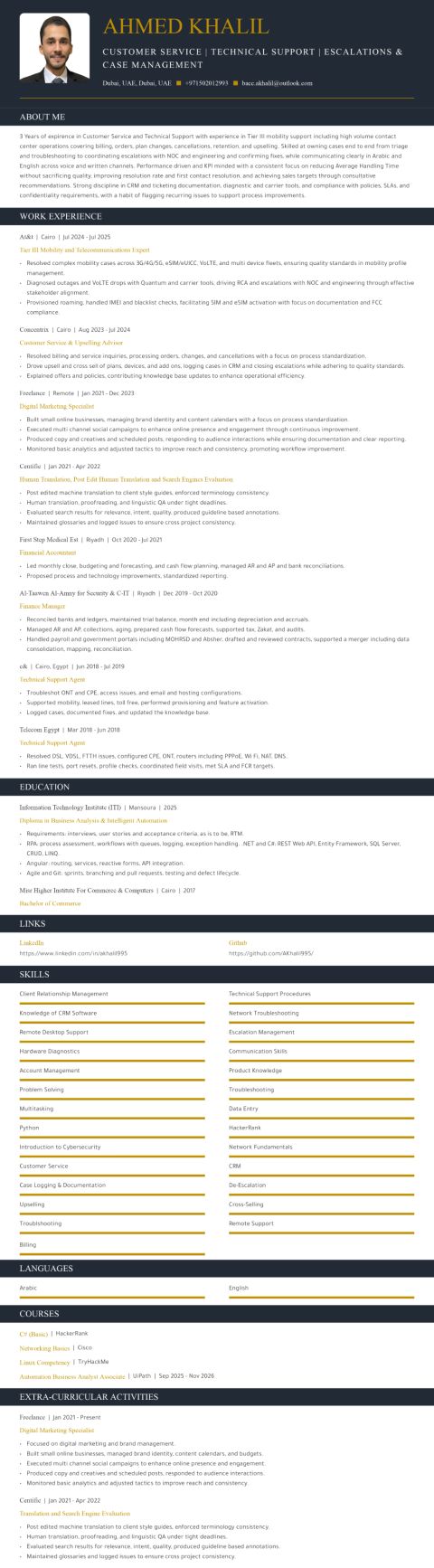 أحمد خليل أخصائي خدمة عملاء ودعم فني أخصائي متميز في خدمة العملاء والدعم الفني بخبرة تزيد عن 3 سنوات في مراكز الاتصال ذات الضغط العالي، متخصص في الدعم التقني المتقدم لقطاع الاتصالات والمحمول. امتلك مهارة إدارة دورة حياة البلاغ بالكامل بدءا من استقبال البلاغ وتشخيص العطل، وصولا الى تنسيق التصعيد مع مركز إدارة الشبكة (NOC) والفرق الهندسية لضمان الحل النهائي، مع التزام تام بالتواصل الاحترافي باللغتين