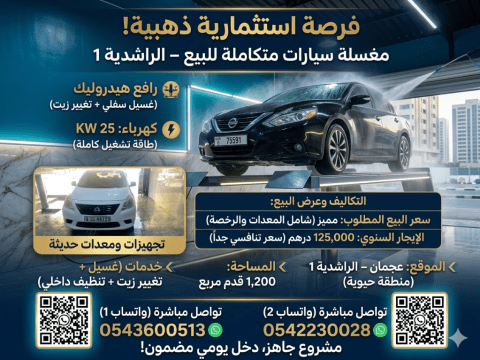 GOLDEN Investment Opportunity - COMPLETE CAR WASH for sale A fully operational and high - income car wash business located in a prime area, ready for immediate takeover. Location Rashidiya 1, Ajman Area 1200 SqFt - Features & Equipment Hydraulic Lift (Bottom Wash + Oil Change) Electricity 25 KW (Full operational capacity) Modern equipment & professional tools Ready project