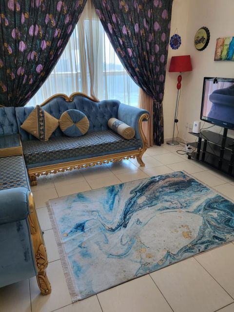 Fully furnished one - bedroom apartment for rent in Al Mamzar Corniche, featuring two bathrooms, a kitchen, and a large balcony with a full water view. The apartment is ready to move in, offering a comfortable and practical layout ideal for singles or couples. Located in a prime area close to the beach, restaurants, shops, and public transportation. monthly rent includes internet, making it a great option