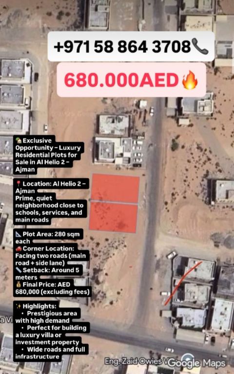فرصة استثمارية مميزة - قطعتا أرض سكنيتان فاخر تان للبيع في منطقة الحليو 2 - عجمان الموقع الحليو 2 - Ajman (Al Helio 2 - Ajman) منطقة راقية وهادئة قريبة من الخدمات والمدارس والمرافق الحيوية المساحة 280 متر لكل قطعة الموقع على شارعين (شارع رئيسي + سكة) ارتداد أمامي حوالي 5 أمتار السعر النهائي 680000 درهم غير شامل الرسوم مميزات الموقع موقع متميز في واحدة من أكثر المناطق طلبا في عجمان - مثالية