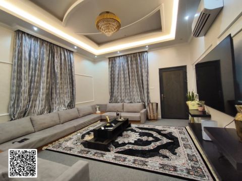 Villa for sale in Ajman, Al Helio area. 5 master bedrooms, living room, Majlis, kitchen, maid's room, laundry room, and kitchen storage. The finishing is very high quality. We do not deal with commercial properties, and the owner is an engineer who oversees the work daily. Gypsum board decorations in a Moroccan style. The kitchens were designed and installed by an interior design company that