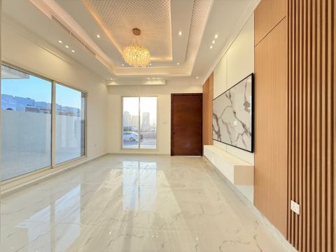 For rent in Al Helio 2, a corner villa consisting of a ground floor, first floor, and roof. The Villa includes 5 master bedrooms, a Majlis, two living rooms, and a maid’s room. It is brand new, first occupancy, and ready to move in, with electricity, water, and air conditioning installed. Annual rent AED140000 Contact us