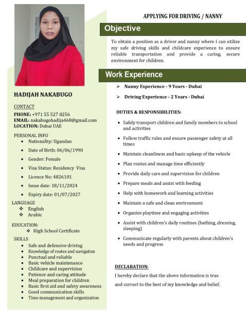 A responsible and experienced Lady Driver/ Nanny is currently looking for a suitable position with a family in Dubai. I prefer a live - out arrangement and I hold my own UAE residence visa, ready to join immediately. I prefer Live Out ad I also have Own Visa though am open to cancel it if necessary. I have over 9 years of nanny experience in Dubai and 2 years of driving experience, providing safe transportation