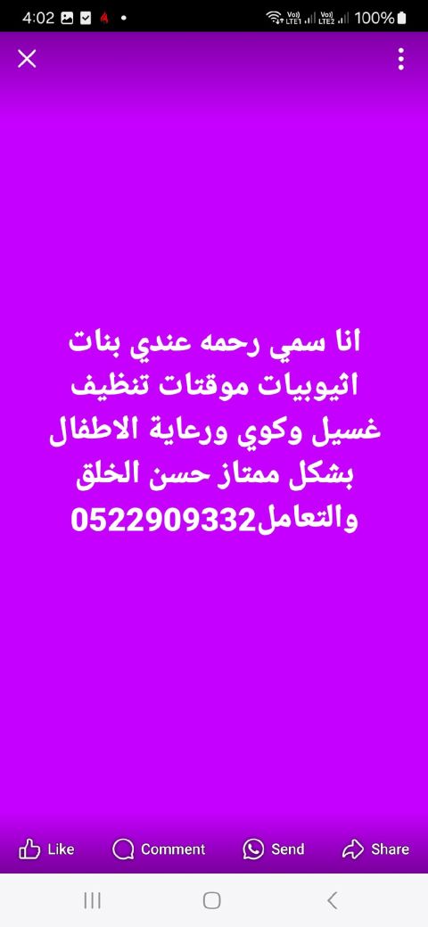 أنا اسمي رحمة عندي بنات أثيوبيات مؤقتات تنظيف غسيل وكوي ورعاية الاطفال بشكل ممتاز حسن الخلق والتعامل