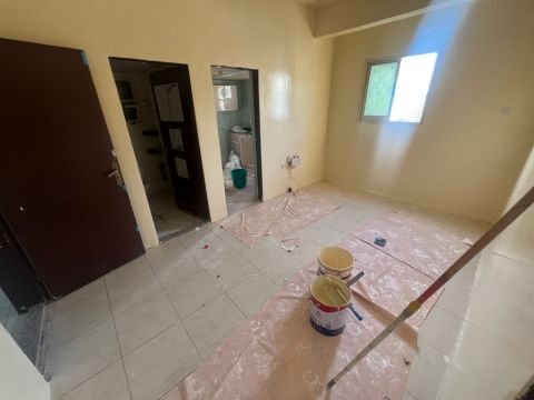 Sharjah, Muwailih Commercial Area for rent, a hall within an apartment consisting of a room, a hall, a private bathroom, and a balcony. Central air conditioning. The apartment is very quiet and clean