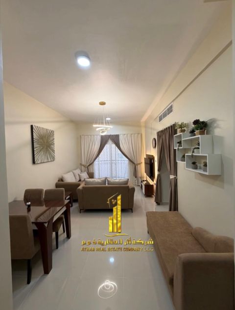 Apartment for monthly rent in Ajman, super deluxe finishing, close to all services, easy exit to Dubai and Sharjah, for monthly rent in Ajman, the finest and most modern furnishings in Ajman, Al Jerf 2, behind the court, directly opposite all malls and services, first inhabitant, furnished studio, high - end furnishings, all bills and internet included, with all devices, large space, bills included