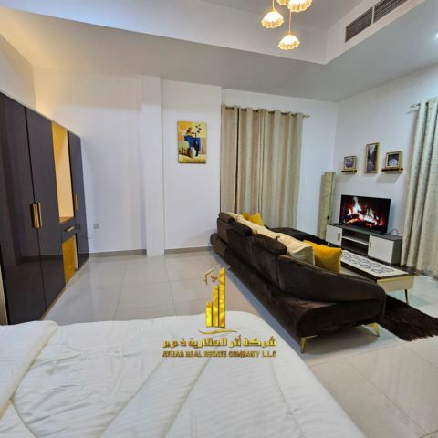 For monthly rent, the most luxurious fully furnished studio in Al Jerf 2, opposite Day to Day, including all bills and internet, and easy access to Dubai and Sharjah with free private parking
