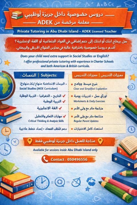 دروس خصوصية داخل جزيرة أبوظبي - معلمة مرخصة من ADEK تدريس المواد الاجتماعية واللغة الانجليزية بخبرة في مدارس الشار تر والمنهاج الأمريكي والبريطاني. شرح مبسط، أوراق عمل، متابعة مستمرة، واستعداد كامل للاختبارات