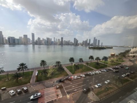 مكتب تجاري للإيجار السنوي في الشارقة منطقة المجاز 1 شارع الملك فيصل اطلالة بحرية مساحة واسعة مجهز بالكامل المساحة حوالي 1550 قدم مربع يقع ببرج تجاري معروف وشهير المكتب مخدم بحمام ومطبخ خاص باركينغ مجاني تسهيلات كبيرة بالدفع كما يتوفر مساحات أكبر وأصغر بنفس البرج