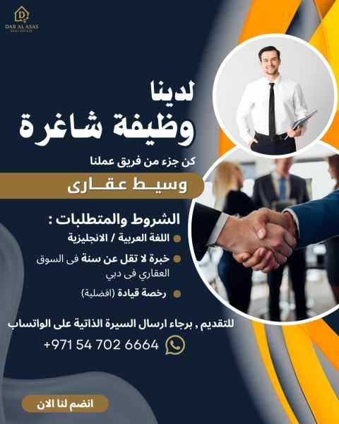 مطلوب للعمل من كلا الجنسين موظفين مبيعات في شركة وساطة عقارية في دبي مقر الشركة في دبي ديرة شروط التقديم (خبرة في مجال الوساطة العقارية لا تقل عن سنة - يفضل وجود رخصة قيادة - طموح ولديه شغف للعمل - لديه لغة عربية وانجليزية) راتب ثابت وعمولة مجزية. الرجاء على من لديه الشروط السابقة ويرغب بالتقديم إرسال السيرة الذاتية على الرقم التالي