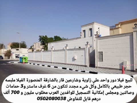 للبيع فيلا في الشارقة منطقة المنصورة دور واحد على زاوية شارعين قار فيها 6 غرف نوم ماستر ومجلس وصالتين موقف سيارات داخل الحوش وموقف بجانب الفيلا على الشارع - الفيلا مجددة بالكامل صيانة جديدة ومكسية في الحجر الطبيعي - مساحة 5 ألف قدم - مطلوب مليون و700 ألف درهم