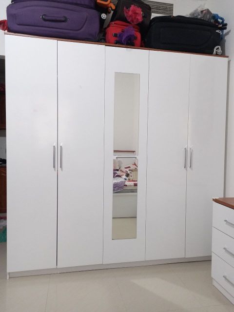 Used king size bedroom set for sale at an attractive price of AED4000 - 5 pieces and a mattress - Bed 190*220*110 cm - Wardrobe 55*220*220 - Mattress 180*210*30 - Mirror Table 120*40*175 - 2 bedside tables 55*40*50