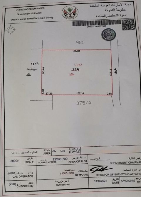 للبيع في إمارة الشارقة منطقة المدام / الحصون مزرعة جميله جدا ومرتبه مسورة بالكامل مع باب حديد مساحة المزرعة 22285700 متر مربع 239883 قدم مربع تسجيل مواطنين جوازات إمارة الشارقة فقط يوجد في المزرعة بناء + أماكن مخصصه للبناء + حديقة مع أماكن مخصصه للشواء المزرعة تتكون من منطقة زراعية كبير جدا بناء يتكون من صالة ومجلسين كبار جدا غرف نوم مع الحمامات المزرعة مناسبة جدا للعائلات مطلوب 1500000 قابل لتفاوض