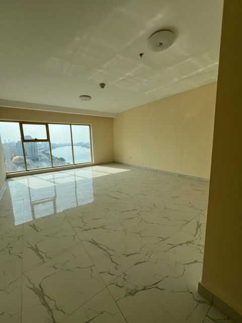 Sea view overlooking Al Majaz Corniche. Spacious three - bedroom apartment with living room, family residence in a prime location. Family tower on a main road, close to Sharjah Museum, the Corniche, and all services. rent AED55000 in 4 payments. Covered parking available for AED4000