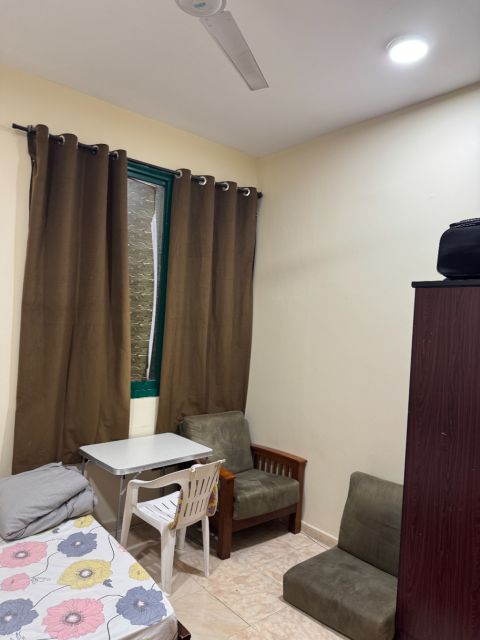 متاح غرفة كبيرة بشقة مفروشة بمطبخ وحمام مشترك للإيجار الشهري وشامل وموقف مجاني بمبلغ 1600 درهم فقط بالشهر مع تأمين مسترد 500 درهم مسترد، النباعة الشارقة، بجوار دوار المطافي خلف نستو بجانب بناية ملبار للبهارات مقابل محطة الباص للتواصل