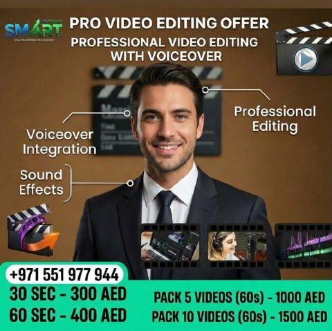 Professional video editing with high - quality voiceover integration and sound effects, perfect for ads and social media. 30 sec for AED300, 60 sec for AED400. Pack of 5 videos (60s) for AED1000, Pack of 10 videos for AED1500. Ideal for businesses and entrepreneurs who want to boost engagement and sales. Book now and upgrade your content professionally
