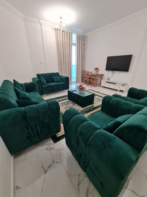 Two rooms and a hall, spacious, furnished, clean and elegant, in Rashidiya Ajman, a distinguished location close to all services, easy exit to Dubai, super deluxe, including internet, electricity and water, parking, gym, Ajman swimming pool, a distinctive view of Al Hoor. rent 6500