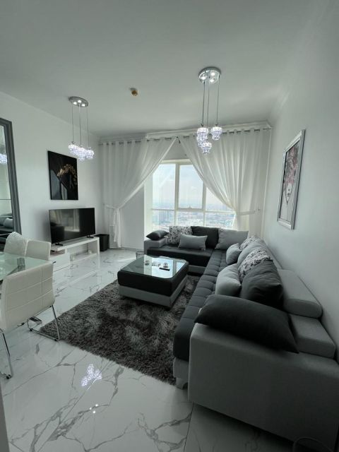 Monthly rent in Ajman, Rashidiya area, Al Murror Street, behind Grand Mall, close to Ajman One Towers, furnished studio, clean furniture, separate kitchen, large area, central air conditioning, price 2500, including bill, electricity, water, sewage, and internet available