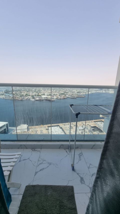 Ajman furnished studio, spacious, in a new location, a family tower only in Rashidiya, Ajman, Al Waha Towers, a distinguished location close to all services, easy exit to Dubai and Sharjah, close to Nesto and Brand Mart, with a gym, swimming pool, parking, and a balcony with a sea view, rent at a price of 3700