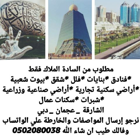 مطلوب للبيع أو الإيجار شقق - فلل - بيوت شعبية - بنايات - أراضي في الشارقة - دبي - عجمان نرجو من السادة الملاك الكرام ارسال التفاصيل والخرائط علي