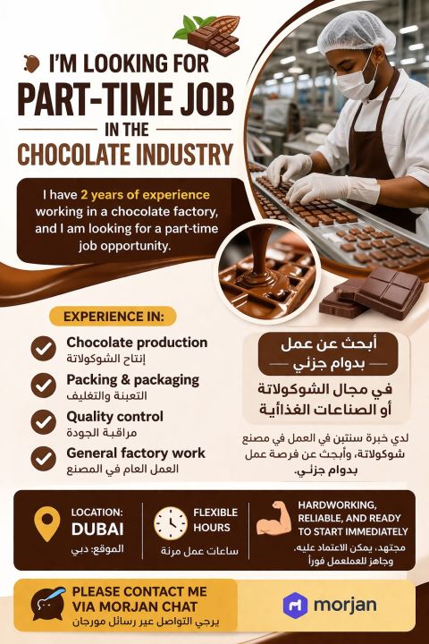 I am currently looking for a full time or part time position in the chocolate or food production industry. in a chocolate factory, with strong skills in Chocolate molding Tempering Filling Chocolate production Packing & packaging Quality control General factory work I am hardworking, reliable, and quick to learn, with a strong commitment to maintaining high production standards. Available f