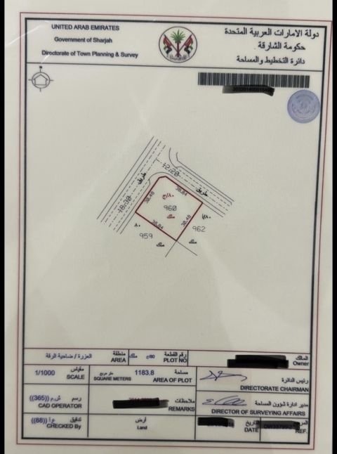 للبيع أرض في الشارقة منطقة بطينة / حي شرق مساحة الأرض 5000 قدم مربع تصريح أرضي + 6 مطلوب 1.6 مليون