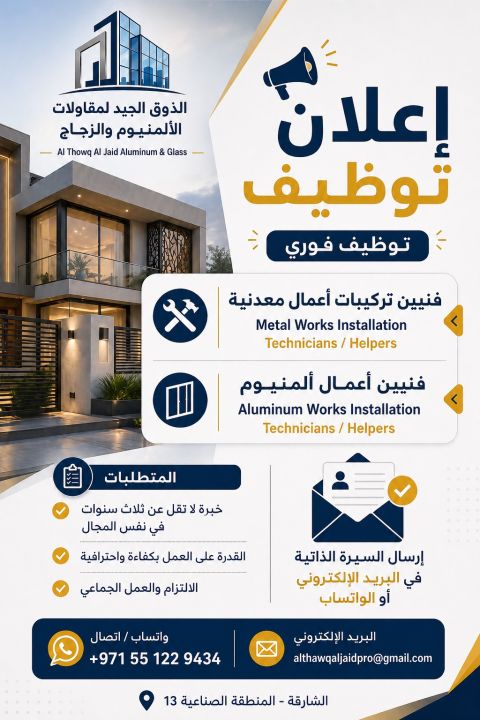 IMMEDIATE HIRING Al Thowq Al Jaid Aluminum & Glass is hiring Metal Works Installation (Aluminum & Steel) side Foreman - Technicians - Helpers - Minimum 3 years of experience