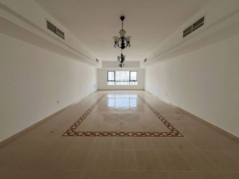 Annual rent apartment in Sharjah - Al Taawun. 3 bedrooms + living room with maid room, laundry room, balcony, and parking. Prime location close to all services. Payment in 4 or 6 cheques, no extra fees