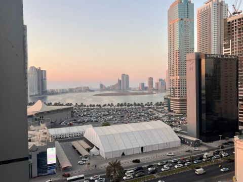 Free Central AC Free Gym & Pool Apartment for Annual rent in Al Taawun - Sharjah 3 Master Bedrooms + Built - in Wardrobes in 2 Rooms + Master Maid's Room + Spacious Hall + Hallway in Front of Rooms + Functional Kitchen + 4 Clean Bathrooms + Balcony with Side & Open sea view Dirt Parking Strategic Location Close to Dubai Exit, Next to Supermarket, Mosque, and Main Street Quiet Family Environment