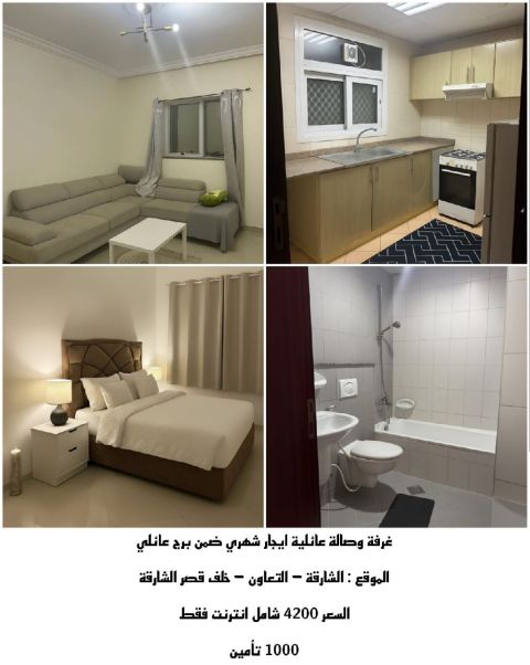 شقة مفروشه غرفة وصالة نظيفة ومرتبه في التعاون الشارقة ب 4500 شامل الانترنت الحجز والسكن فوري عروض - تأجيرات - الشارقة
