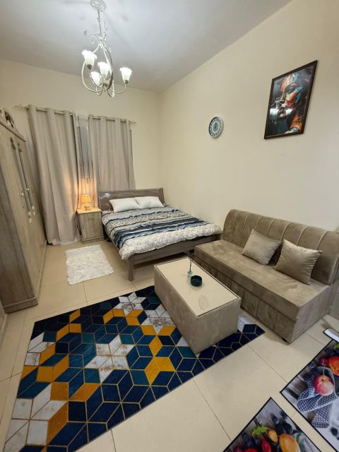 Monthly rent in Ajman, Al Yasmeen Towers, opposite Ajman City Center, furnished studio, clean furniture, large area, central air conditioning, separate kitchen, price 3200, including bill, electricity, water, sewage, and internet, all services are available, excellent location, easy exit, Mohammed Bin Zayed City