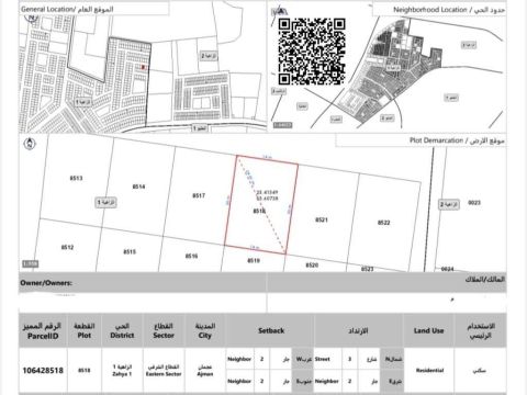 Land for sale in Ajman, Al Zahiyah Building permit for a townhouse Area 302 SQM 3250 SqFt Land location Price AED670000 including registration fees