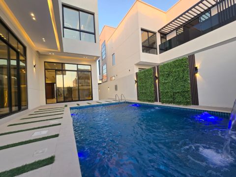 Modern villa for rent in Al Bahia. First occupancy, ready to move in. Parking space in front of The Villa. Spacious yard with shade. Large private swimming pool with garden. Consists of Majlis (formal sitting room) and 2 living rooms. 5 master bedrooms. Built - in wardrobes throughout. Fully equipped main kitchen. Preparation kitchen. Central air conditioning throughout The Villa. Maid's room with bathroom