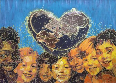 عمل فني للاقتناء "نبض العالم" لوحة تعانق الانسانية في لوحة "نبض العالم" تتجسد رسالة حب عالمية، حيث يتداخل فيها الفن ليصبح صوتا ينادي بالوحدة. تترجم اللوحة وجوها بريئة تنتمي الى ثقافات مختلفة، محاطة بتكوين هندسي يشبه خيوطا ذهبية لامعة، وكانها تربط بين أطراف الكون. في قلب اللوحة، يتشكل قلب كبير يحمل خريطة العالم، وكأنه ينبض بحياة واحدة، حياة البشرية جمعاء. هذا القلب ليس مجرد رمز، بل هو مصدر الطاقة
