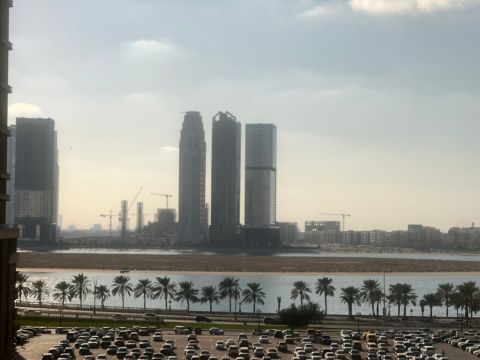 For rent in Al Khan - Al Qasba, second tenant apartment featuring 2 master bedrooms and a living room with a balcony and beautiful sea view. The kitchen also enjoys a sea view. 3 bathrooms, extra built - in wardrobes, and dedicated parking. The tower is only 2 years old No gym or pool. Annual rent AED60000