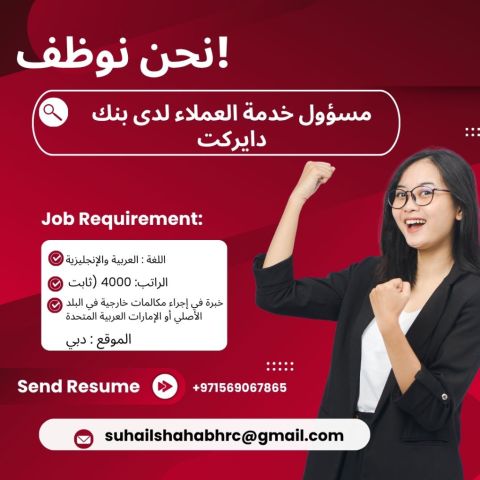 We are looking for customer sales executives for direct bank. must speak Arabic and English, salary AED4000 location Dubai arab nationality can apply send resume