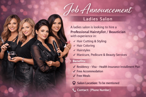 Job Announcement - Ladies salon A ladies salon is looking to hire a professional hairstylist/ beautician with experience in Hair cutting and styling - Hair coloring - Hairstyles - Manicure, pedicure, and other beauty services Benefits Installment plan for (residency - visa - health insurance) Free accommodation - Free meals salon location Al Ain/ Alshwaib Contact