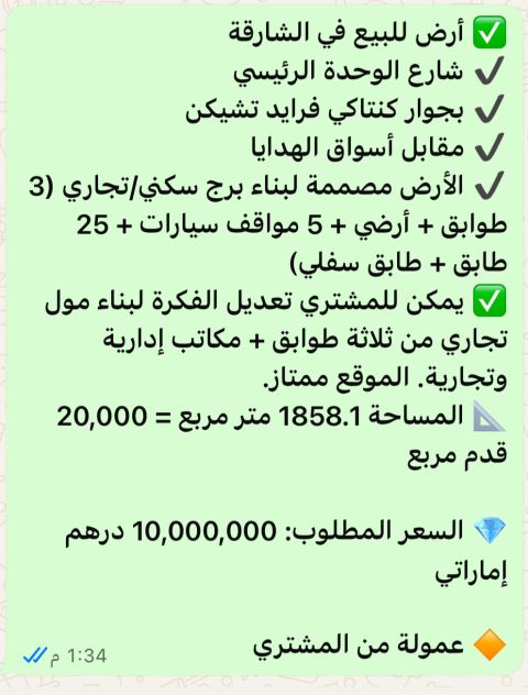 مطلوب من (المالك مباشرة) أراضي صناعية في الشارقة وعجمان للبيع والاستثمار يرجى ارسال الخارطة والمواصفات على واتساب للجادين فقط