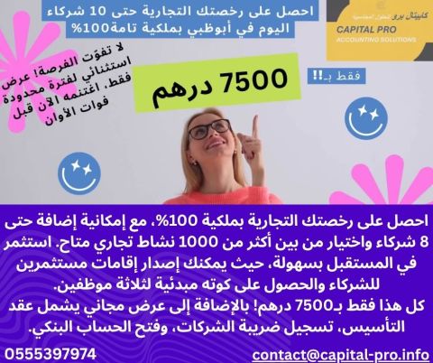 Get your Commercial Trade license with 100% ownership, with the ability to add up to 8 partners and choose from over 1000 available business activities. Invest in your future with ease, as you can issue investor residencies for partners and receive an initial quota for three employees. All this for only AED7500 Plus a free quote that includes the articles of association, corporate tax registration