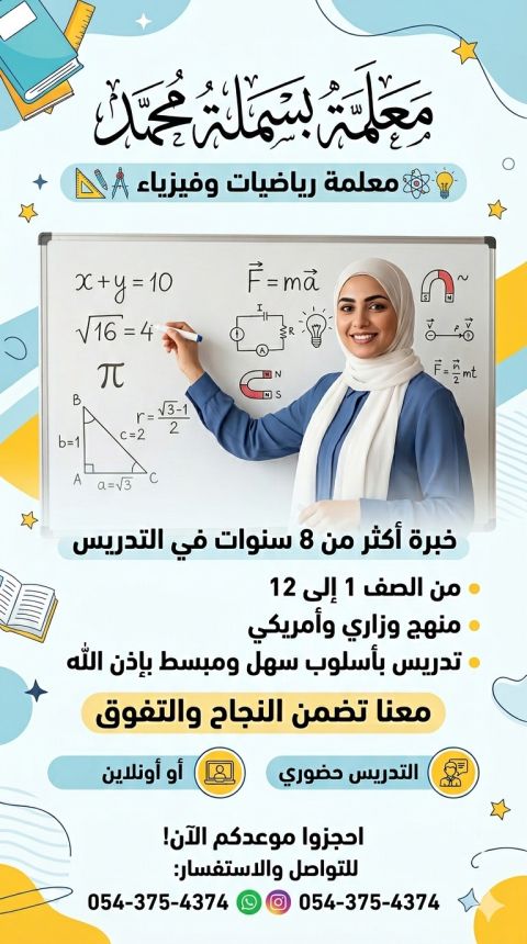معلمة رياضيات وفيزياء خبرة من 8 سنوات في التدريس من صف 1 الى 12 منهج وزاري وأمريكي تدريس بأسلوب سهل وبسيط بإذن الله معنا تضمن النجاح والتفوق التدريس حضوري أو اونلاين
