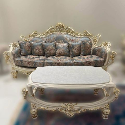 Classic furniture set for sale Made in Egypt with high quality fabric Set of 2 long chairs, 4 small chairs, 2 long table, 2 small table All for AED5000 Some damages from cat scratches Pickup in Khalifa City only