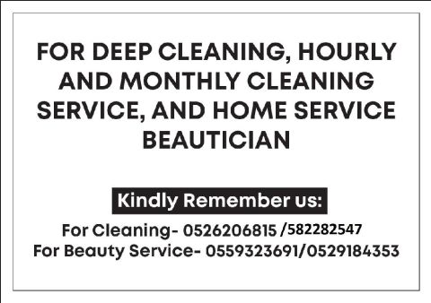 Cleaning Assistance Available Trained staff available for regular or one - time home cleaning. We assist with Floor cleaning - Surface dusting - Washroom & kitchen cleaning Available in Ajman and Sharjah. Contact now for booking