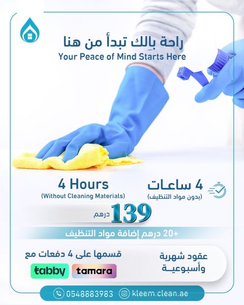 Looking for a trusted cleaning company in Sharjah We provide professional cleaning services that let you feel the difference from the very first visit Apartment - Villa - Office cleaning Trained and experienced team On - time commitment Affordable prices for everyone Safe tools and cleaning products Save your time for what really matters and leave the cleaning to us Contact us now and book easily