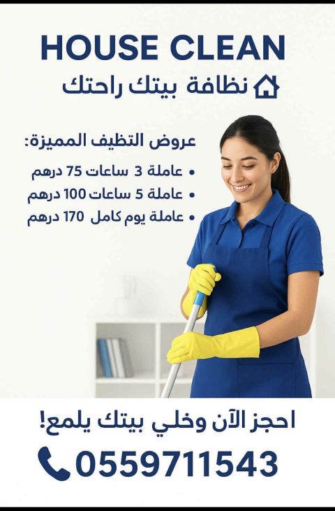 عروض العيد الوطني لتنظيف منازل في مدينة العين عاملة 3 ساعات 75 درهم عاملة 5 ساعات 100 درهم عاملة يوم كامل 170 درهم للحجز