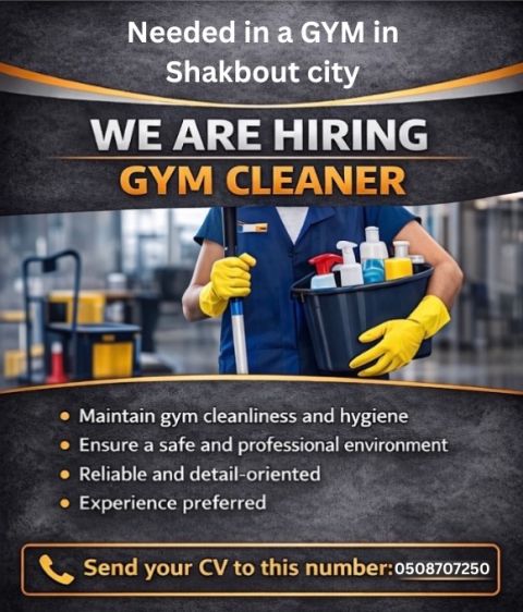 We are hiring cleaner at our gym Shakhbout City If you are interested in the position shown, please send your CV to the number below