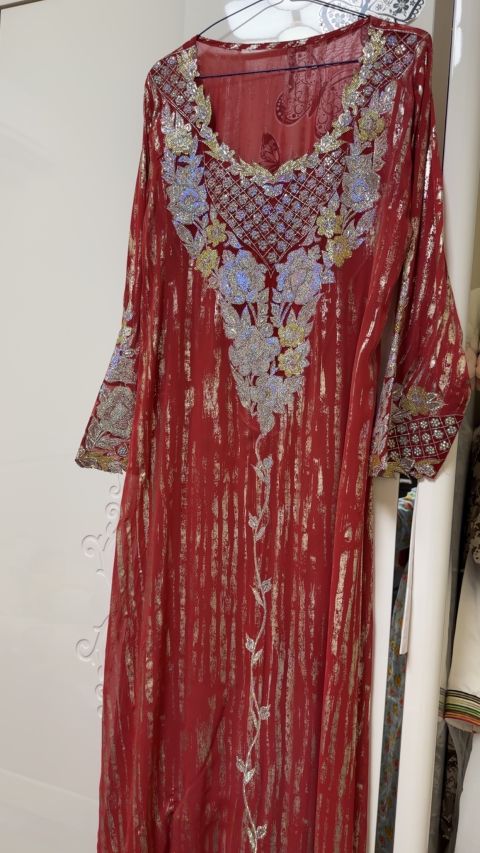 جلابية شيفون بتطريز أحمر. جديدة للبيع. مقاس لارج. السعر 250 درهم. للتواصل