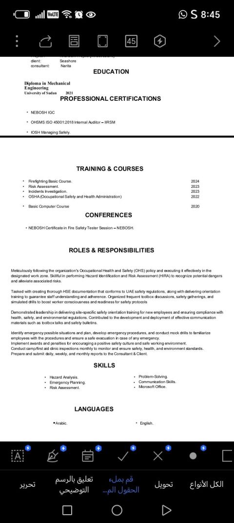 ضابط سلامه بخبرة 5 سنوات داخل الامارات في شركات المقاولات الكبري أحمل دبلوم هندسة ميكانيكا حاصل علي شهادات نيبوش واوشا وايوش Fire ولدي الكثير من الدورات ولدي رخصة قيادة اماراتية أجيد عمل تقارير السلامة جميعها وأجيد عمل TBT والتفتيش علي ppe وتطبيق سياسات السلامة ونشر ثقافة السلامة بالوسائل الحديثة وتصميم البوسترات واصدار PTW أجيد الانجليزية الهنديه مصطلحات سلامه فقط والتوجيهات المعنية