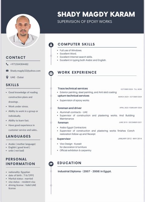 فورمان وسوبر فايزر معدات ثقيله ومشروعات البنيه التحتية والبايب لاين وكت وفل وخبرة 10 سنوات وأجيد أعمال الحفر وتشغيل المعدات والعماله وادارة المواقع خبرة مشروعات البنيه التحتية وأحمل ليسن اماراتي